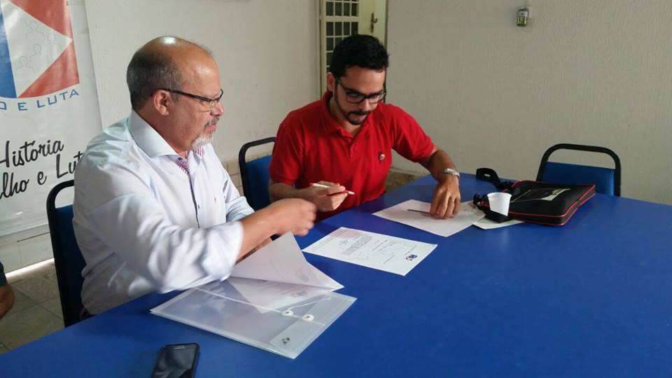 Presidente do SISMUC Regional, Eduardo Mendonça, fazendo a entrega da Pauta de Reivindicações elaborada pela categoria dos Servidores Públicos do Município, ao candidato Professor Jefferson Abraão do PCB. O postulante assinou o seu compromisso em caso de ser eleito como próximo gestor de Caruaru.