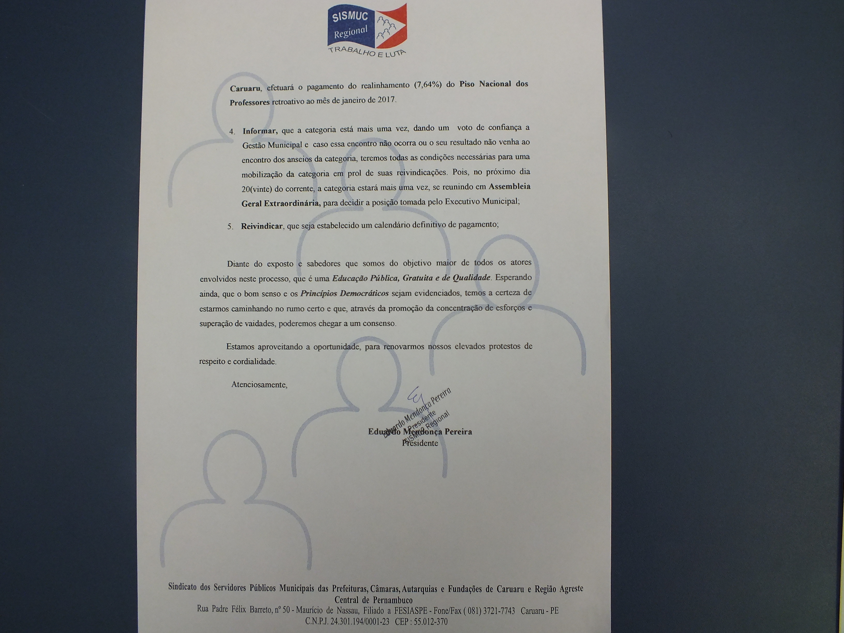 Na manhã do dia 05 de abril de 2017, na sede da União Beneficente dos Artistas de Caruaru, a Diretoria Executiva do SISMUC Regional realizou uma Assembleia Geral Extraordinária com os servidores da Educação do município de Caruaru, onde foi decidida a suspensão da paralisação de advertência, que aconteceria nos dias 05 e 06 de abril, conforme explicitado em documento em anexo.