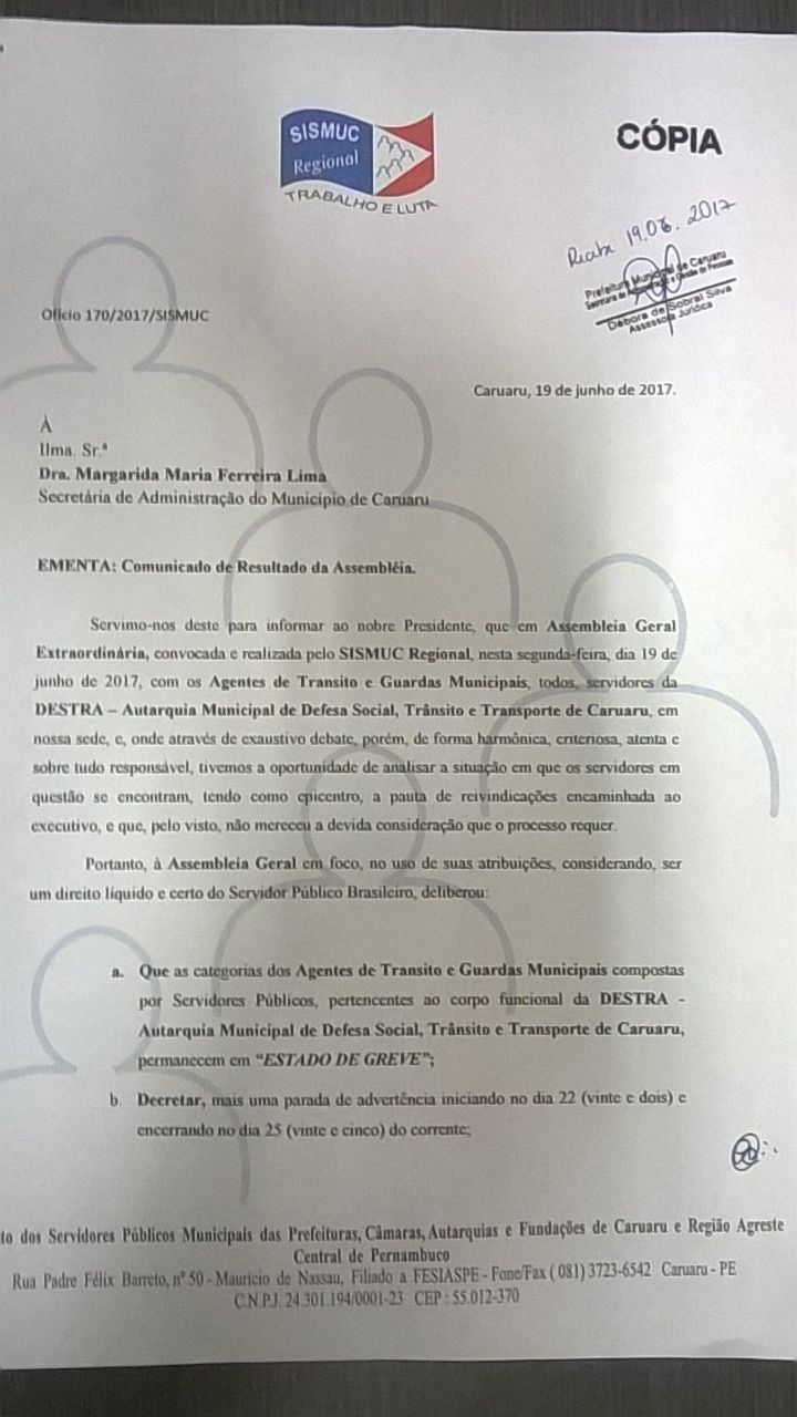 O Ofício foi entrega a Dra. Margarida Maria Ferreira Lima (Secretária de Administração do Município de Caruaru), com cópia ao Coronel Hermes José de Melo (Diretor Presidente da DESTRA – Autarquia Municipal de Defesa Social, Transito e Transporte).