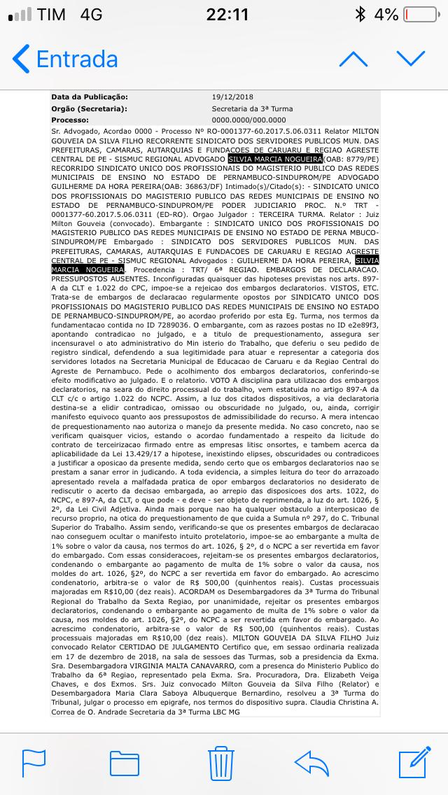 A nova derrota do SINDUPROM veio na tentativa de entrar com um Recurso chamado “Embargos de Declaração”, mas o TRT da 6ª Região, novamente, deu a vitória, por unanimidade, ao SISMUC REGIONAL, declarando assim, a rejeição dos Embargos de Declaração, e reforçando a legitimação do SISMUC REGIONAL, em ser o único representante legal, dos Professores de Caruaru e Região Agreste de Pernambuco. Com mais essa derrota, o SINDUPROM fica obrigado pagar uma multa de 1% do valor da causa, mais acréscimo condenatório e custas processuais.