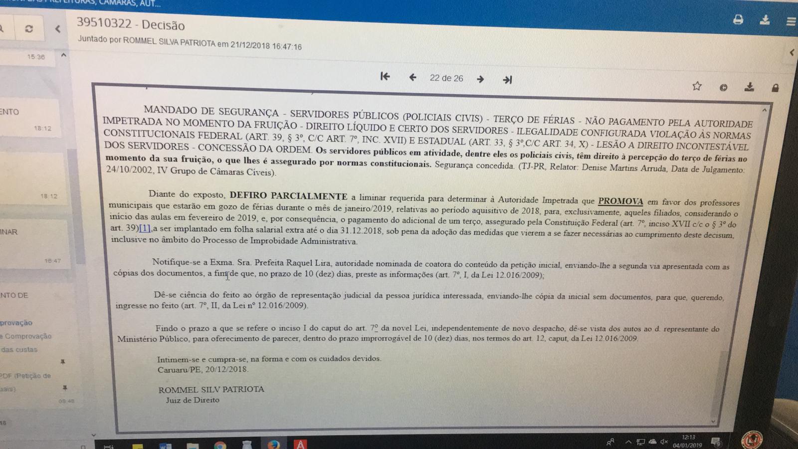 Com a finalidade de assegurar o Direito dos Professores, a Justiça acatou o pedido de Mandado de Segurança, feito pelo SISMUC REGIONAL, contra a Prefeitura de Caruaru, onde assegura, em favor dos Docentes Municipais associados ao Sindicato, que estão de férias durante o mês de janeiro de 2019, o pagamento adicional de um terço, previsto na Constituição Federal. O não pagamento poderá incidir um Processo de Improbidade Administrativa, para a Prefeitura de Caruaru.