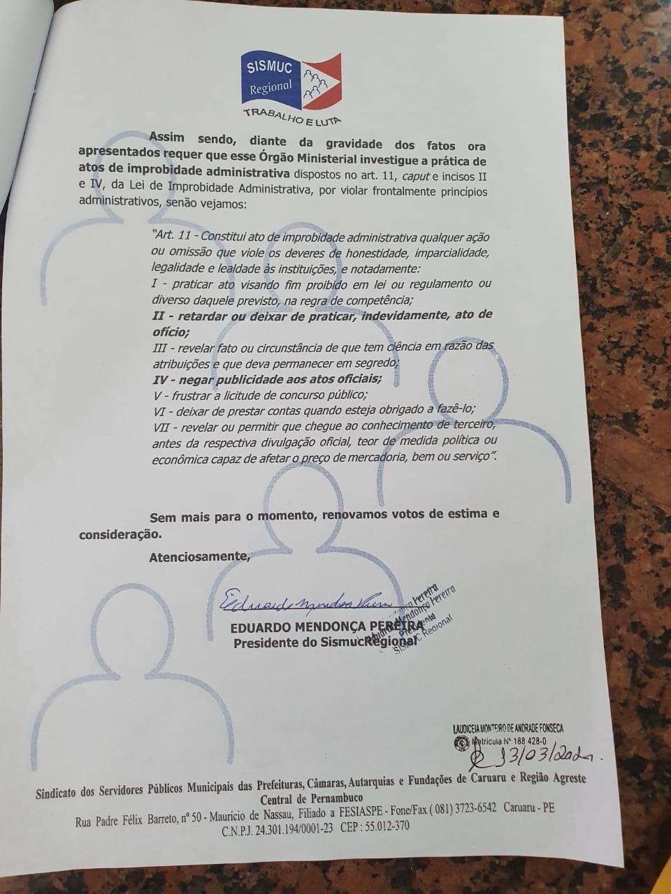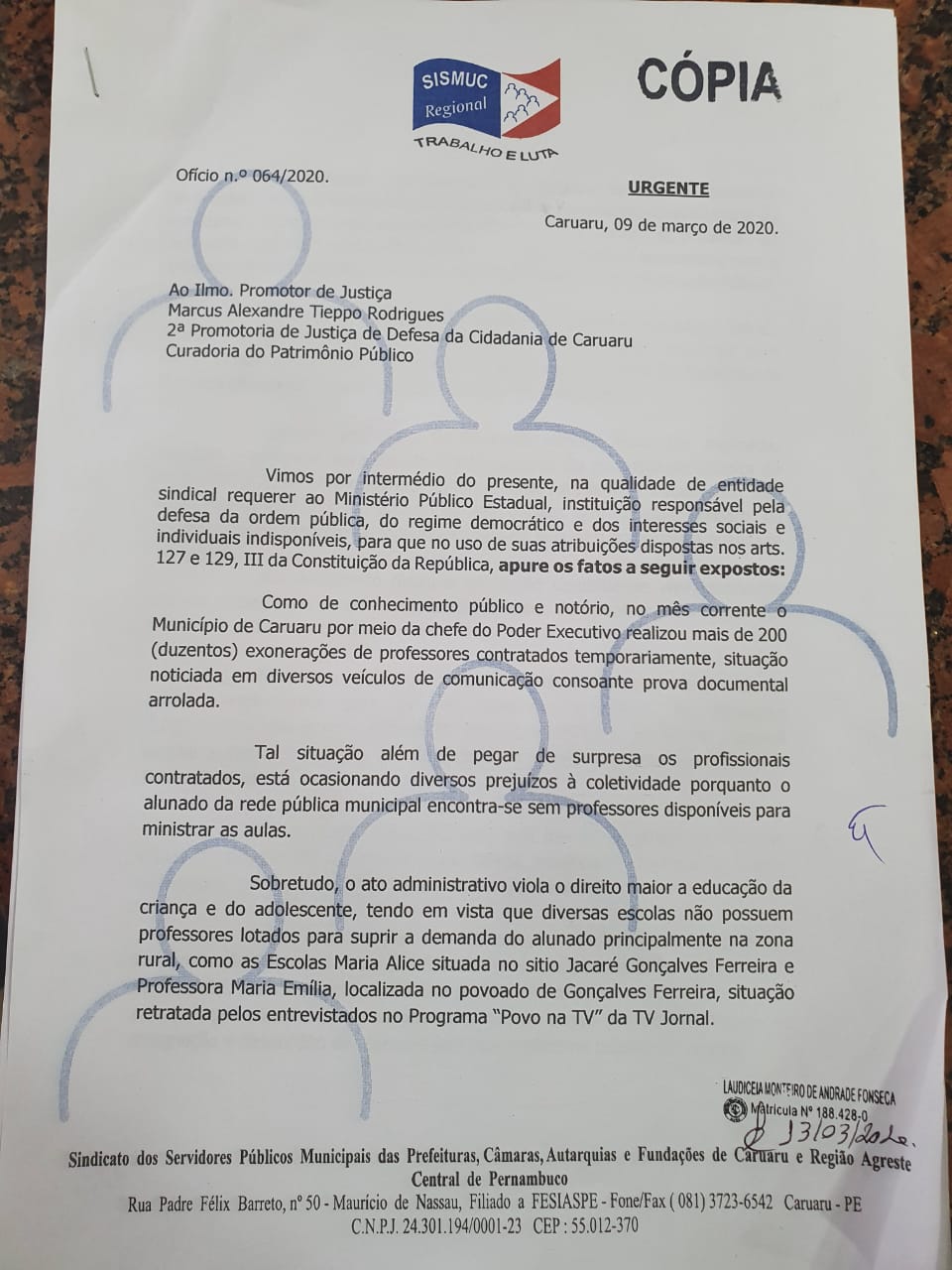 O presidente do SISMUC REGIONAL, Eduardo Mendonça, encaminhou nesta sexta-feira (13), um ofício à 2ª Promotoria de Justiça de Defesa da Cidadania de Caruaru, solicitando que apure às mais de 200 exonerações de professores, realizadas pelo poder Executivo Municipal, exonerações essas que ocasionaram diversos prejuízos à coletividade.