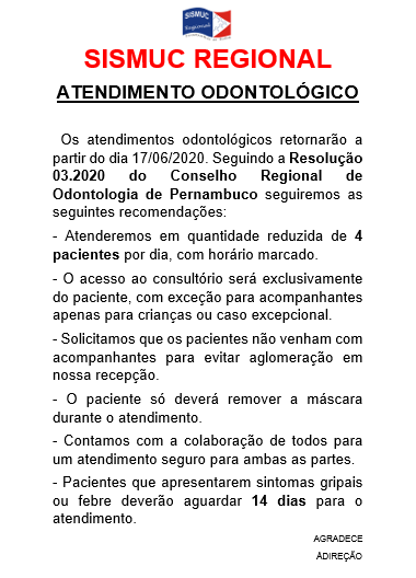 Os atendimentos odontológicos retornarão a partir do dia 17/06/2020. Seguindo a Resolução 03.2020 do Conselho Regional de Odontologia de Pernambuco seguiremos as seguintes recomendações: