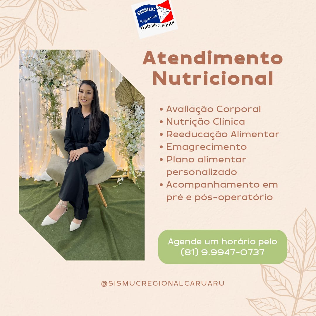Todas as sextas-feiras, os servidores associados ao SISMUC - Regional podem se consultar com a nutricionista, Eduarda Mendonça, em nossa sede. Para esse serviço é necessário agendamento, por meio do número (81) 9.9947-0737. Os atendimentos iniciam sempre às 8h.