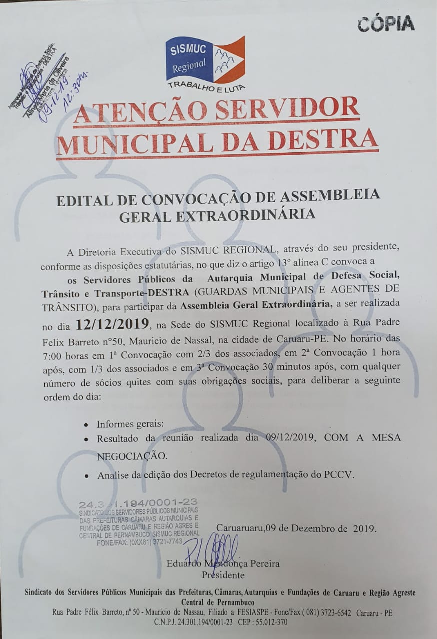 Devido aos Agentes de Trânsito e Guardas Municipais considerem frustradas as negociações da Mesa Permanente de Negociação, o SISMUC REGIONAL fará uma Assembleia Geral Extraordinária com a categoria, no dia 12 de dezembro, às 07h, na sede do próprio Sindicato.