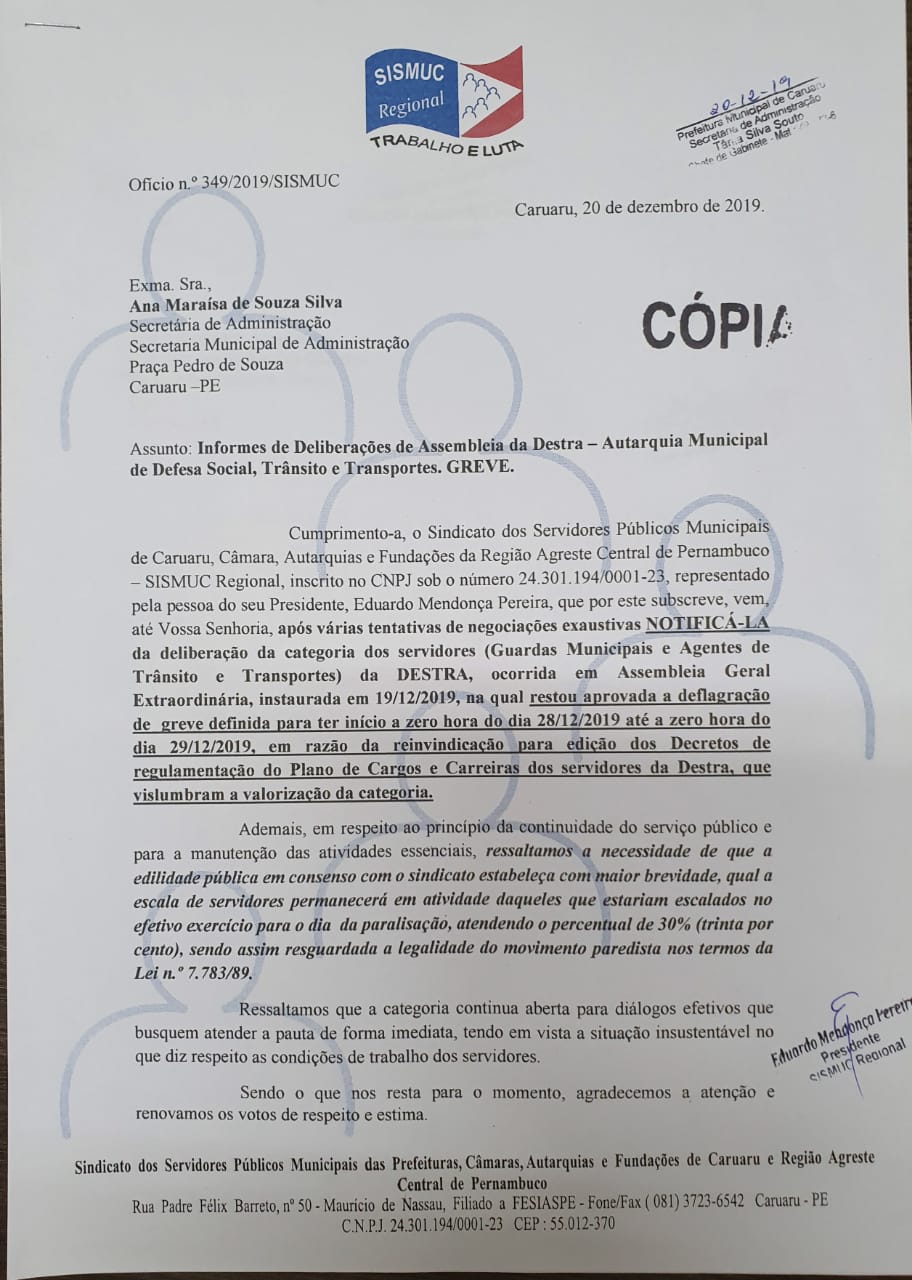 Em Assembleia Geral Extraordinária, ocorrida na manhã de hoje (27), na sede do SISMUC REGIONAL, os Servidores da DESTRA - Guardas Municipais e Agentes de Trânsito, decidiram suspender a greve que aconteceria amanhã (28).