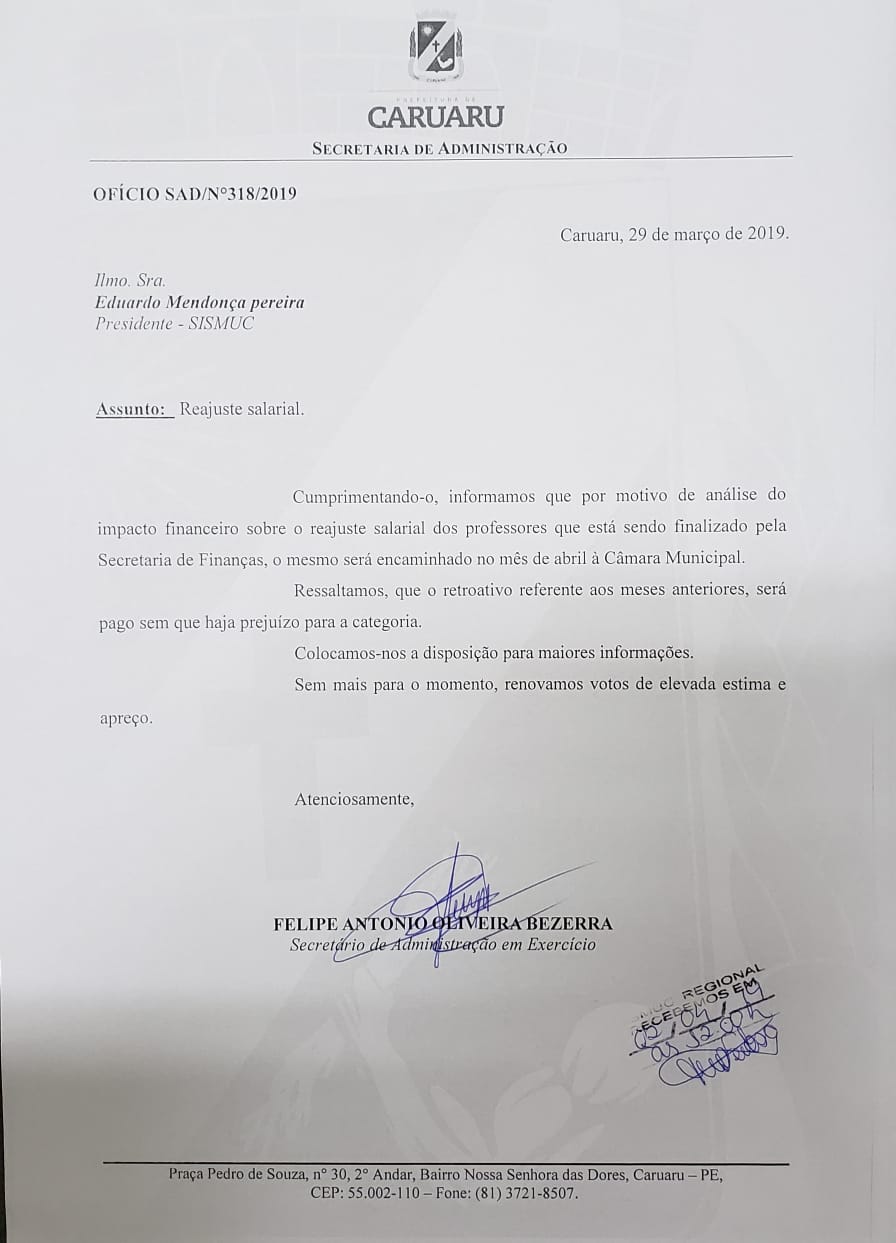 Sempre pautado na ética e no empenho constante em favor dos Professores de Caruaru, O SISMUC Regional encaminhou ao Município suas reivindicações sobre o reajuste salarial da categoria. Esta semana o Sindicato recebeu da Secretaria de Administração do Município de Caruaru, resposta sobre o assunto,