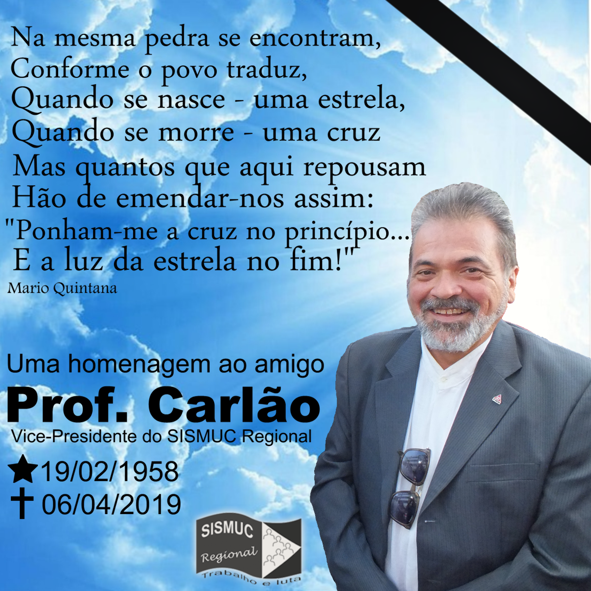 É com Grande pesar que o SISMUC Regional Informam o falecimento do nosso Vice-Presidente e amigo, Carlos Amaral (61), carinhosamente conhecido como Professor Carlão. Sua morte nos deixa um vazio enorme, e um sentimento de saudade eterna.