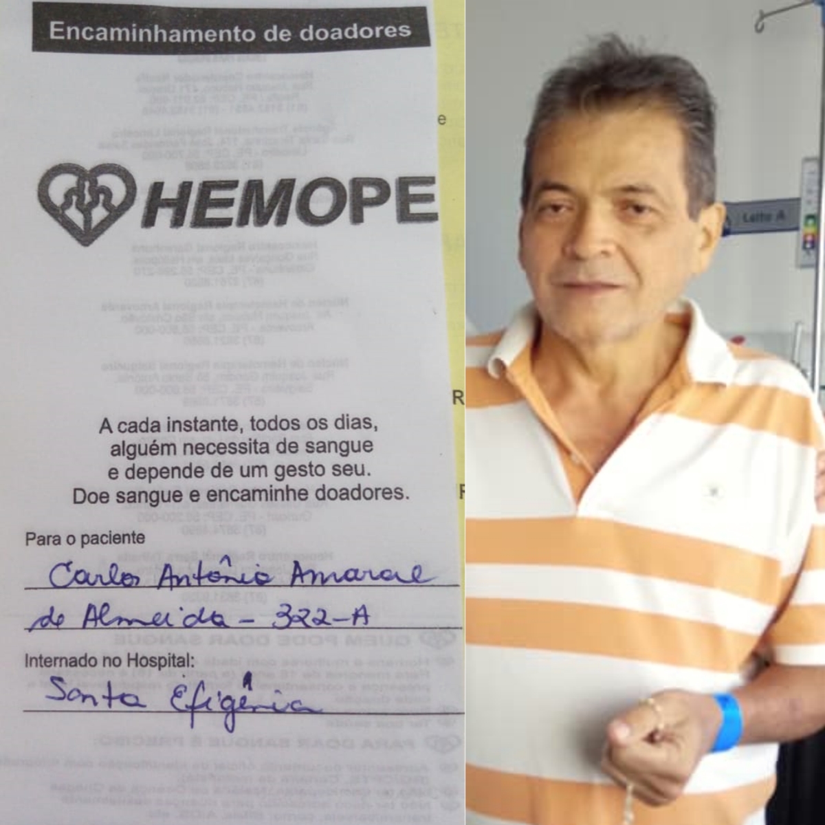 Amigos e amigas Servidores de Caruaru, o amigo, companheiro e Vice-Presidente do SISMUC, Carlos Amaral, mais conhecido como Professor Carlão encontra-se internado no Hospital Santa Efigênia, precisando de sua ajuda para doação de sangue. Quem puder ajudar, favor ir até o HEMOPE, para fazer uma doação de sangue em seu nome.