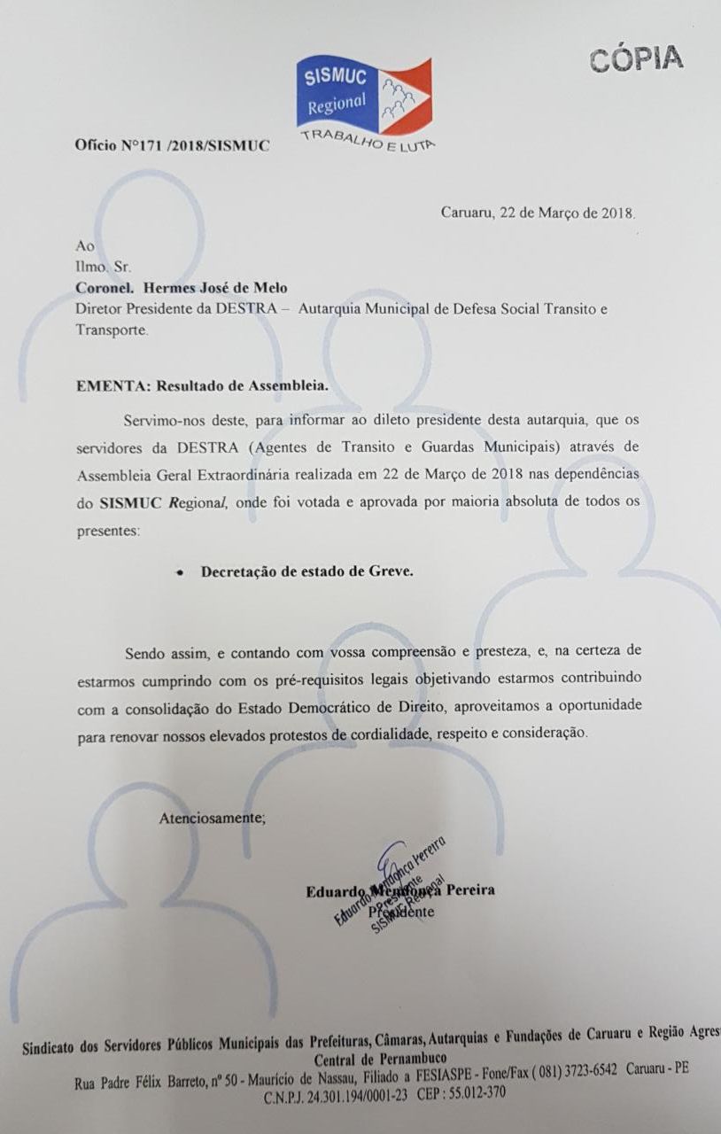 A Diretoria Executiva do SISMUC Regional, na figura do seu Presidente Eduardo Mendonça, conforme as disposições estatutárias, realizou Assembleia Geral Extraordinária, na manhã desta quinta-feira, 22 de março de 2018, na sede do Sindicato dos Servidores Municipais de Caruaru - SISMUC, com os Guardas Municipais e Agentes de Trânsito, para avaliação do resultado da reunião com a mesa permanente de negociação da Prefeitura de Caruaru, ocorrida no dia 21 de março deste mês.