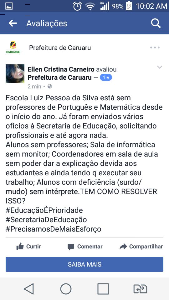 Professora faz apelo para a Prefeitura de Caruaru, para que se normalize a situação docente e de equipamentos, da Escola Luiz Pessoa da Silva. O assunto consta na Pauta de reivindicações do SISMUC REGIONAL, junto a Mesa Permanente de Negociação.