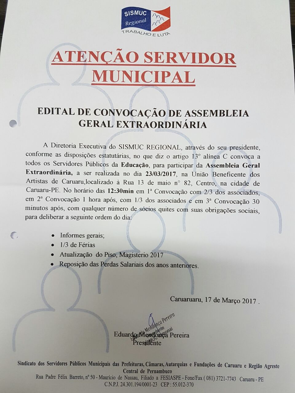 A Diretoria Executiva do SISMUC REGIONAL, na figura do seu Presidente Eduardo Mendonça, conforme as disposições estatutárias, convoca todos os servidores da educação para uma Assembleia Geral Extraordinária, a ocorrer no dia 23 de março de 2017, na União Beneficente dos Artistas de Caruaru, no horário das 12:30h, conforme consta no edital em anexo.