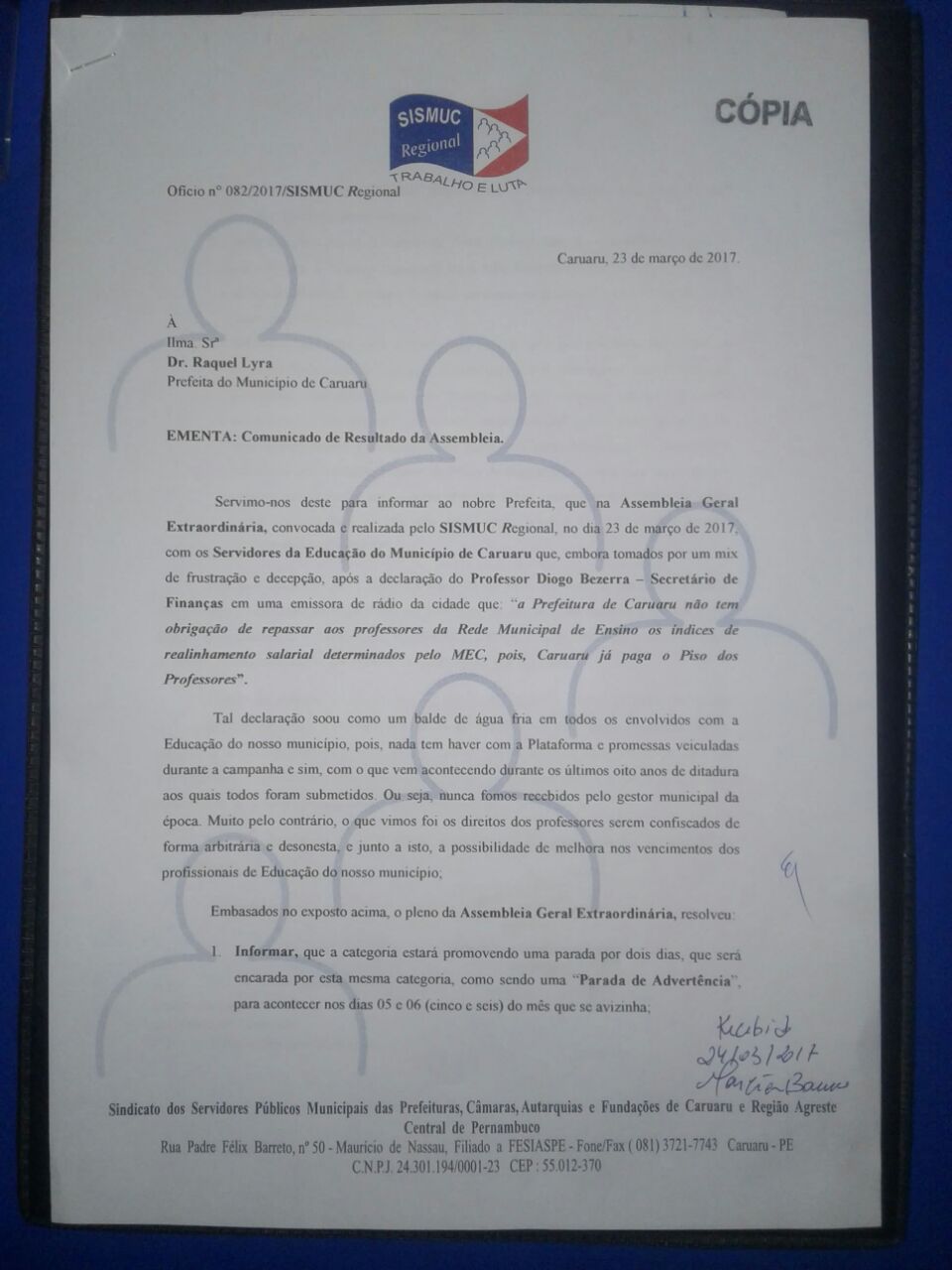 SISMUC REGIONAL envia, pela 5ª vez, à Chefe do Executivo de Caruaru, Raquel Lyra, solicitação para debater assuntos pertinentes aos Servidores Municipais, bem como comunicação da Assembleia Geral Extraordinária, que acontecerá no próximo dia 23 do mês em curso.