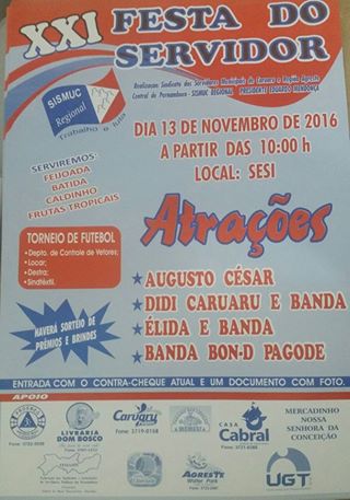 Vai acontecer neste próximo domingo, 13, a partir das 10h, no SESI-Caruaru, a XXI Festa do Servidor, promovida pelo Sindicato dos Servidores Municipais de Caruaru e Região Agreste – SISMUC Regioinal.