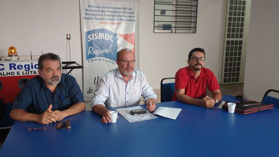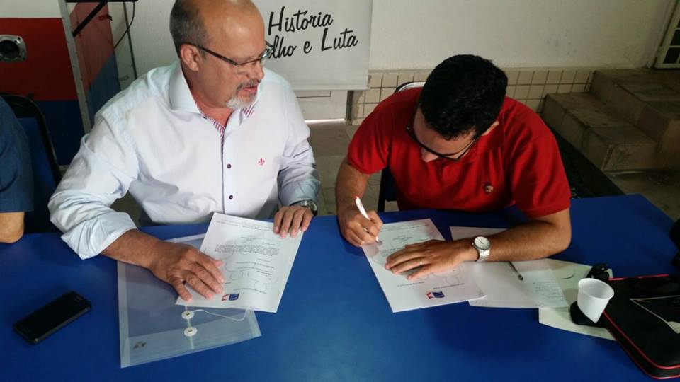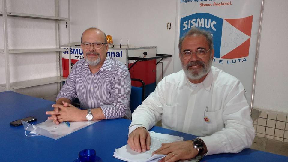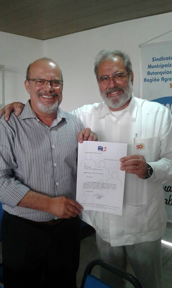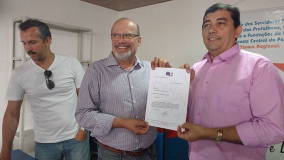 O candidato a prefeito de Caruaru, Rivaldo Soares do PHS, recebe do Presidente do SISMUC Regional, Eduardo Mendonça, a pauta de reivindicações da categoria e assina o seu compromisso com a classe.