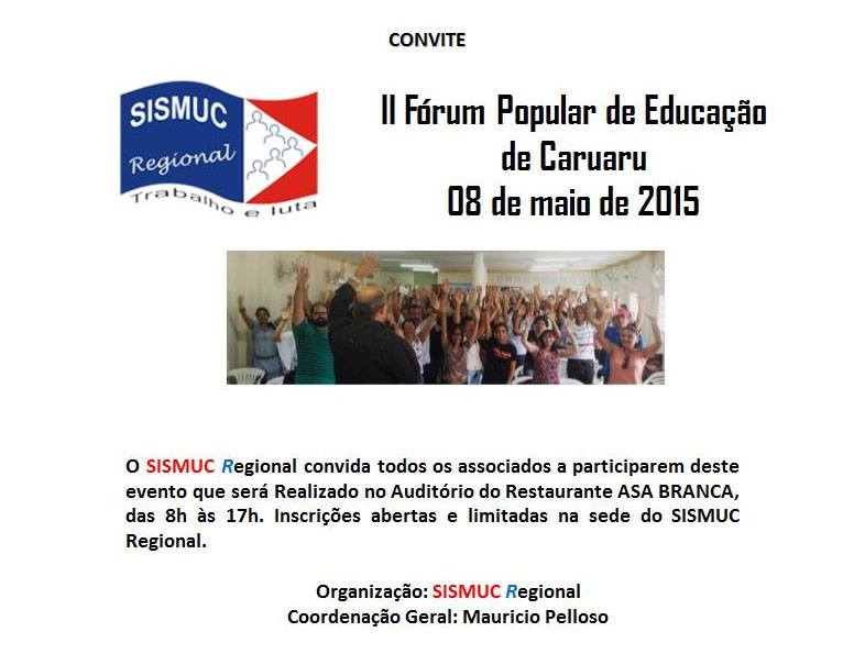 O SISMUC Regional convida todos os associados a participarem deste evento que será Realizado no Auditório do Restaurante ASA BRANCA, das 8h às 17h. Inscrições abertas e limitadas na sede do SISMUC Regional.