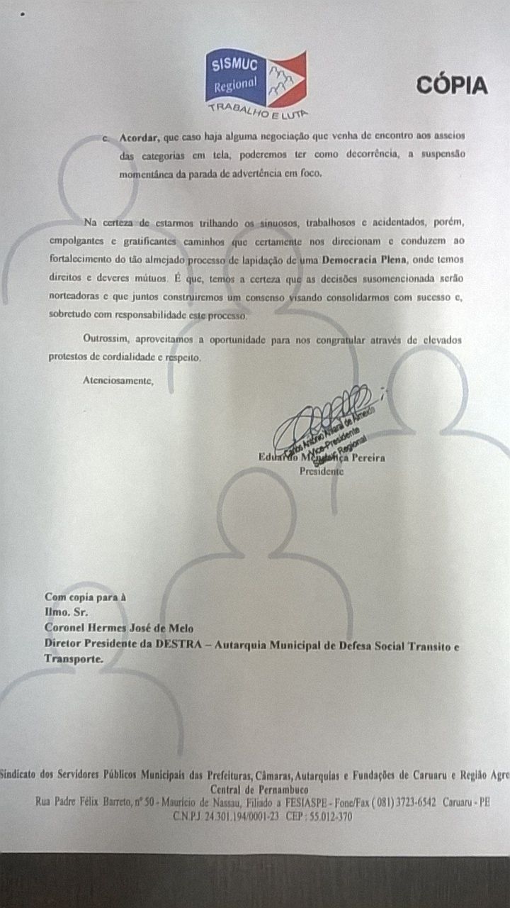 O Ofício foi entrega a Dra. Margarida Maria Ferreira Lima (Secretária de Administração do Município de Caruaru), com cópia ao Coronel Hermes José de Melo (Diretor Presidente da DESTRA – Autarquia Municipal de Defesa Social, Transito e Transporte).